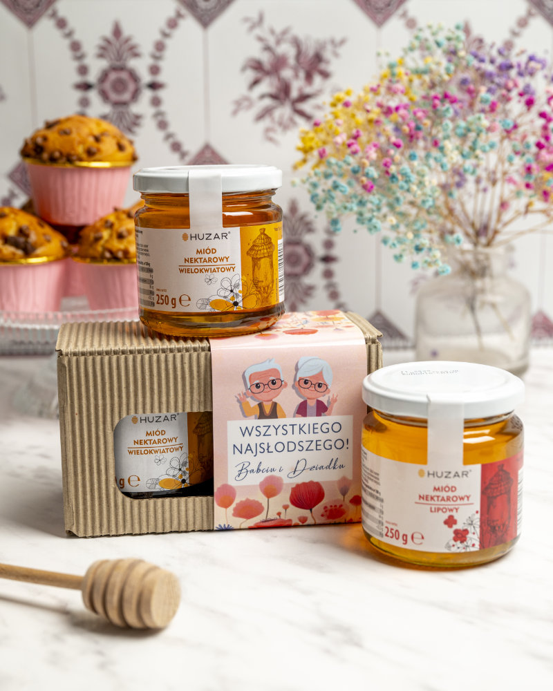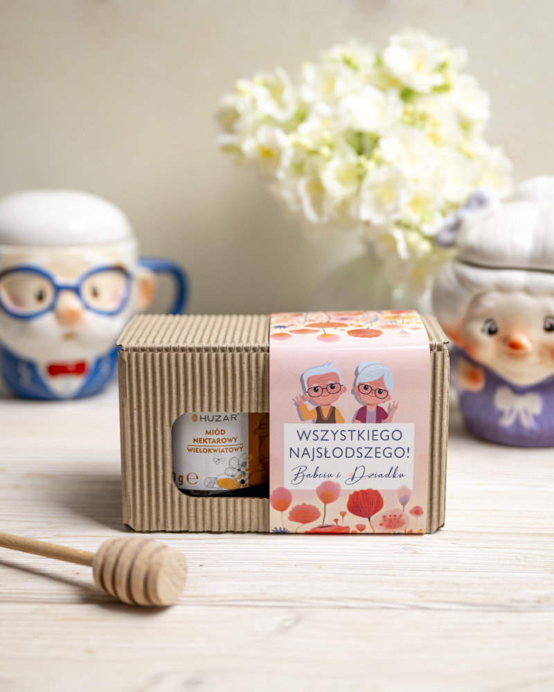 Całość zapakowana jest w estetyczne pudełko z ozdobną, tematyczną owijką, stworzoną specjalnie z myślą o Dniu Babci i Dziadka. Naturalne miody w eleganckiej oprawie sprawiają, że zestaw prezentuje się wyjątkowo i od razu gotowy jest do wręczenia.